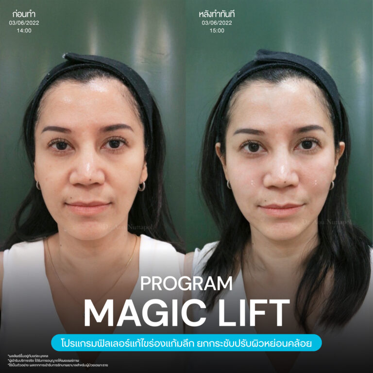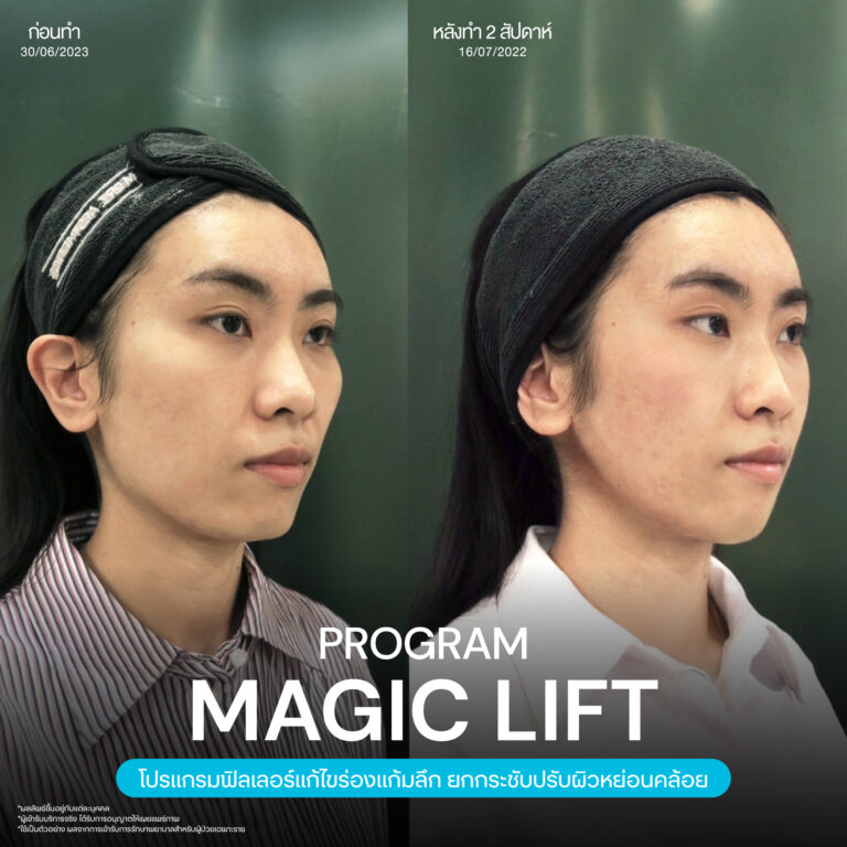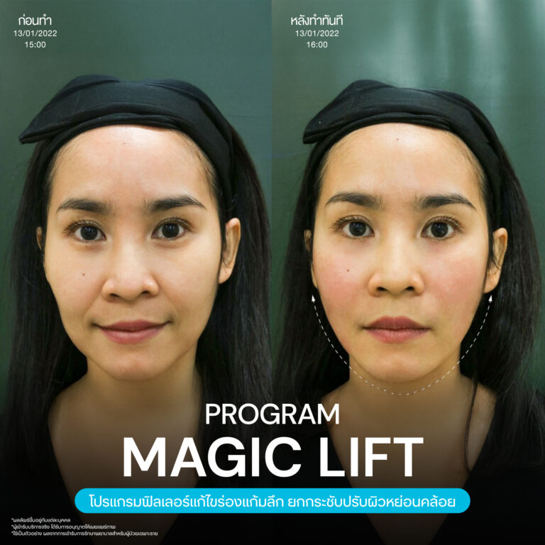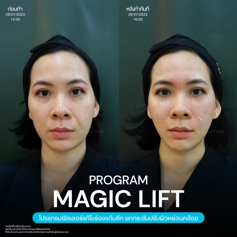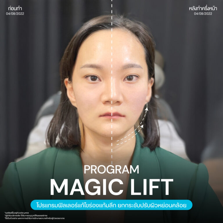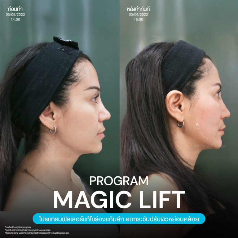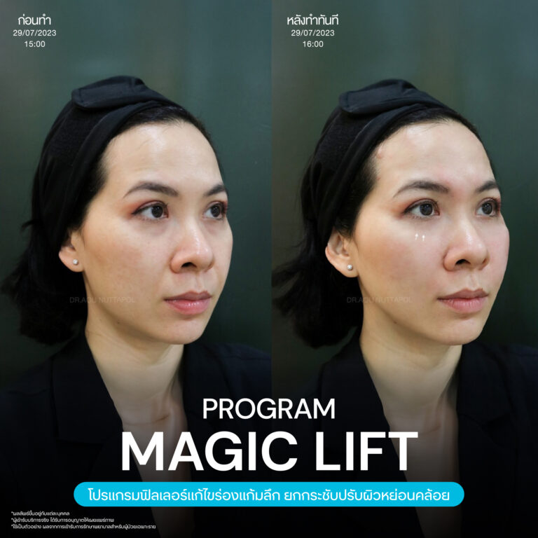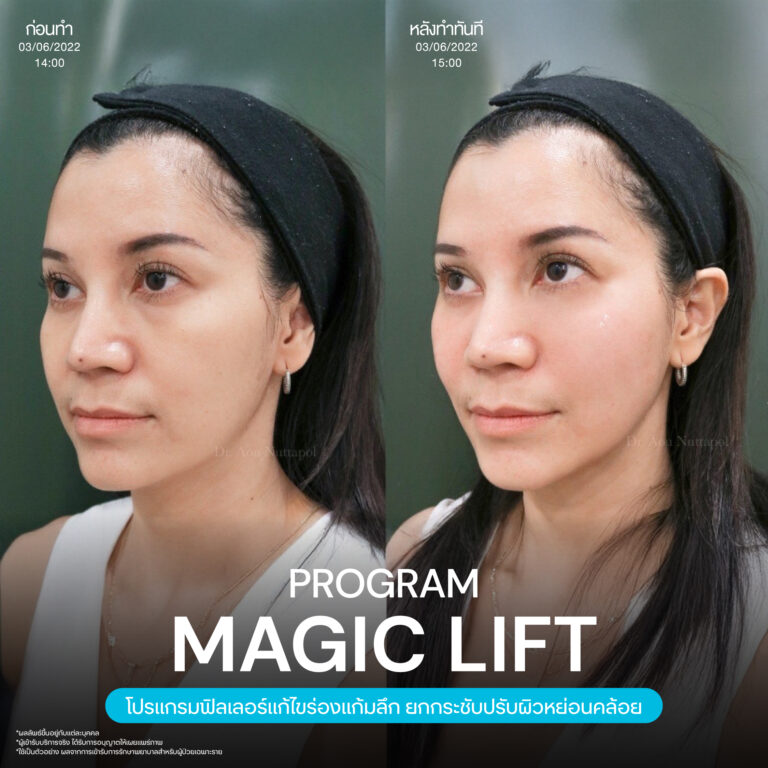 Magic Lift โปรแกรมการฉีด HA Filler เพื่อแก้ไขปัญหาทรงแก้ม ร่องแก้ม ใบหน้าที่มีความหย่อนคล้อย ให้แลดูอ่อนเยาว์ โดยเฉพาะโครงหน้าของสาวเอเชียที่มีโหนกแก้มค่อนข้างสูงและกว้าง เมื่อถูกปรับด้วยโปรแกรมMagic Lift แล้วทำให้ใบหน้าได้สัดส่วนที่สวยงาม และด้วยการเลือกชนิดของโปรแกรม HA Filler ที่เฉพาะเจาะจง เฉพาะบุคคล ผสานกับเทคนิคการฉีดของคุณหมออู๋ ณัฐพล ทำให้ได้ผลลัพธ์ประทับใจ แก้ไขปัญหาลงลึกตามสาเหตุ และแลดูเป็นธรรมชาติ